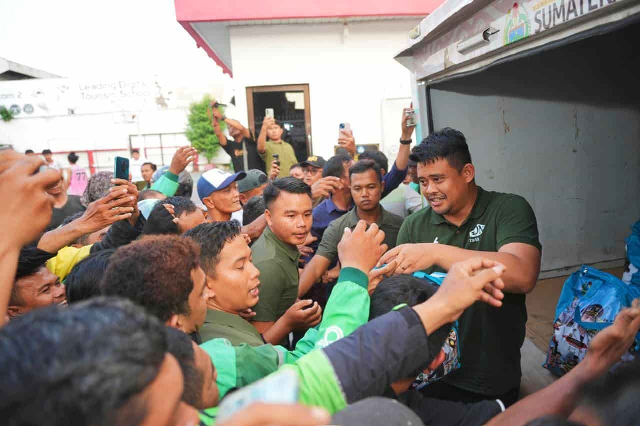 Tampak ratusan pengemudi ojek online (ojol) antusias mengambil paket sembako yang berisi beras, minyak makan, bubuk teh, gula dan indomie. Tak hanya pengemudi ojol, masyarakat yang melintas pun langsung menghentikan laju kendaraannya. Dan dengan cepat mengambil paket sembako yang dibagikan langsung oleh Gubernur Sumatera Utara Bobby Afif Nasution.
