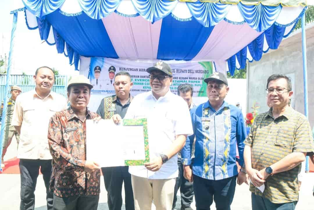 METROKREASI.COM, TANJUNG MORAWA – Bupati Deli Serdang, dr H Asri Ludin Tambunan bersama Wakil Bupati (Wabup), Lom Lom Suwondo SS menyerahkan bantuan 1.800 paket sembilan bahan pokok (sembako) dari PT Evergreen International Paper kepada masyarakat Tanjung Morawa, Jumat (13/3/2026).