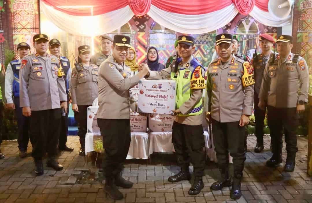 Di Pos Pam GOR Angsapura, Kapolrestabes Medan bersama Tim Itwasum Polri melaksanakan pengecekan dan monitoring pelaksanaan Operasi Lilin Toba 2025 sekaligus menyerahkan paket Natal kepada personel yang bertugas sebagai bentuk apresiasi atas dedikasi dan kesiapsiagaan dalam pengamanan.