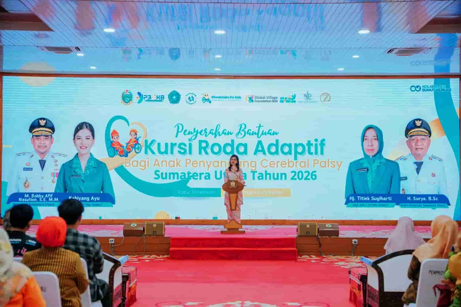 METROKREASI.COM, MEDAN – Ketua Tim Penggerak Pemberdayaan dan Kesejahteraan Keluarga (TP PKK) Provinsi Sumatera Utara (Sumut) Kahiyang Ayu, menyerahkan secara simbolis 135 kursi roda adaptif bagi anak penyandang Cerebral Palsy (CP) di 12 kabupaten/kota se-Sumut. Penyerahan bantuan dilakukan bersama Direktur Global Village Foundation, Mr Andy Baracey, di Aula Tengku Rizal Nurdin, Jalan Sudirman, Medan, Rabu (18/2/2026).