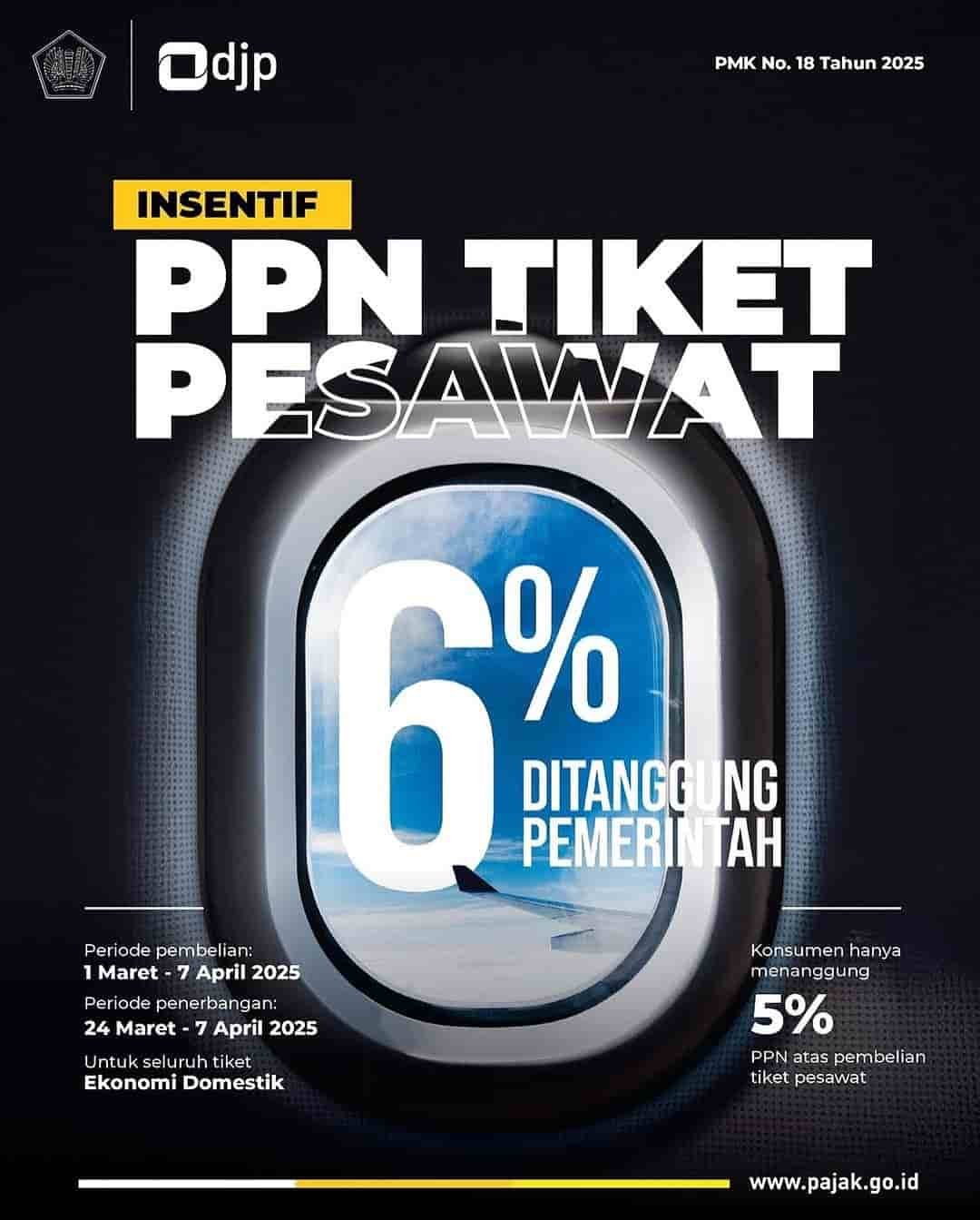 Metrokreasi.com, Jakarta, 7 Maret 2025 – Pemerintah menerbitkan Peraturan Menteri Keuangan (PMK) Nomor 18 Tahun 2025 tentang Pajak Pertambahan Nilai atas Penyerahan Jasa Angkutan Udara Niaga Berjadwal Dalam Negeri Kelas Ekonomi yang Ditanggung Pemerintah Tahun Anggaran 2025 (PMK-18/2025). PMK-18/2025 tersebut ditetapkan pada tanggal 27 Februari 2025 dan berlaku pada tanggal 1 Maret 2025.