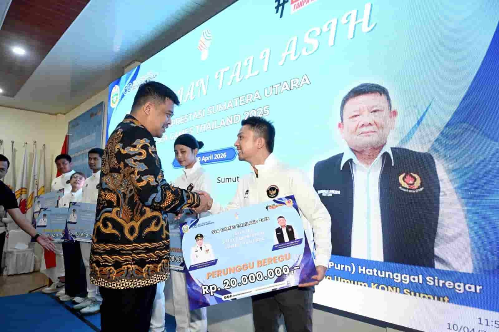 “Kebanggaan Indonesia, atlet ini punya nilai tawar berbeda, saya minta tolong benar-benar jadikan atlet kita ini sebagai start awal bisa mencapai Indonesia emas 2045,” kata Gubernur Bobby Nasution saat penyerahan di Kantor Komite Olahraga Nasional Indonesia (KONI) Sumut, Jalan Willem Iskandar, Deliserdang, Jumat (10/4/2026).